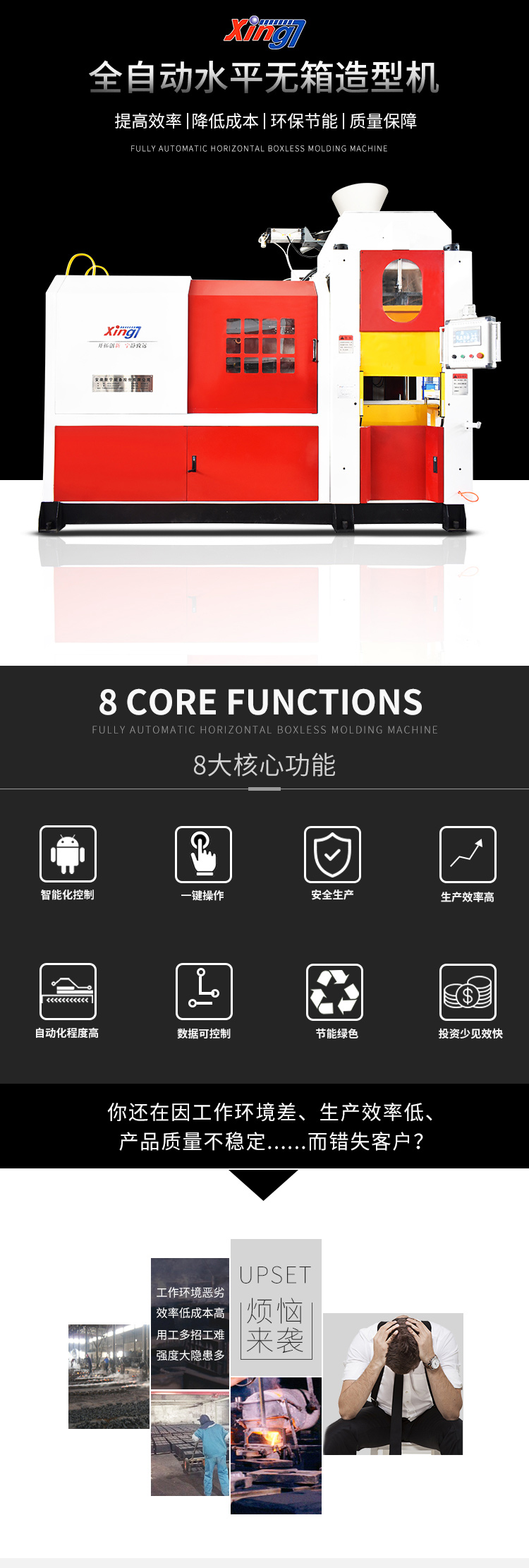 高效率高配置,全自動運行,一鍵式操作,無需人為干涉,安全可靠,砂型參數(shù)可調(diào)。